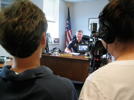 Tim Warren conducts an interview with Darien Police Chief, Duane Lovello.