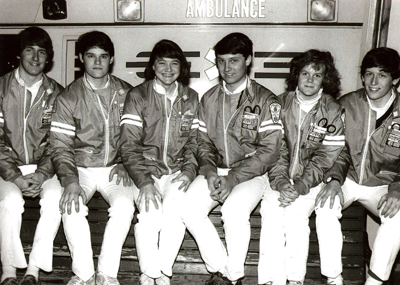 Darien EMS - Post 53 elected officers 1984-1985. Left to Right. Treasurer-Frank Melbourne, President-Rob Clark, VP Programming-Jill Correnty, VP Operations-Tim Warren, Secretary-Mary Dostal, VP Training-Matt Collins.